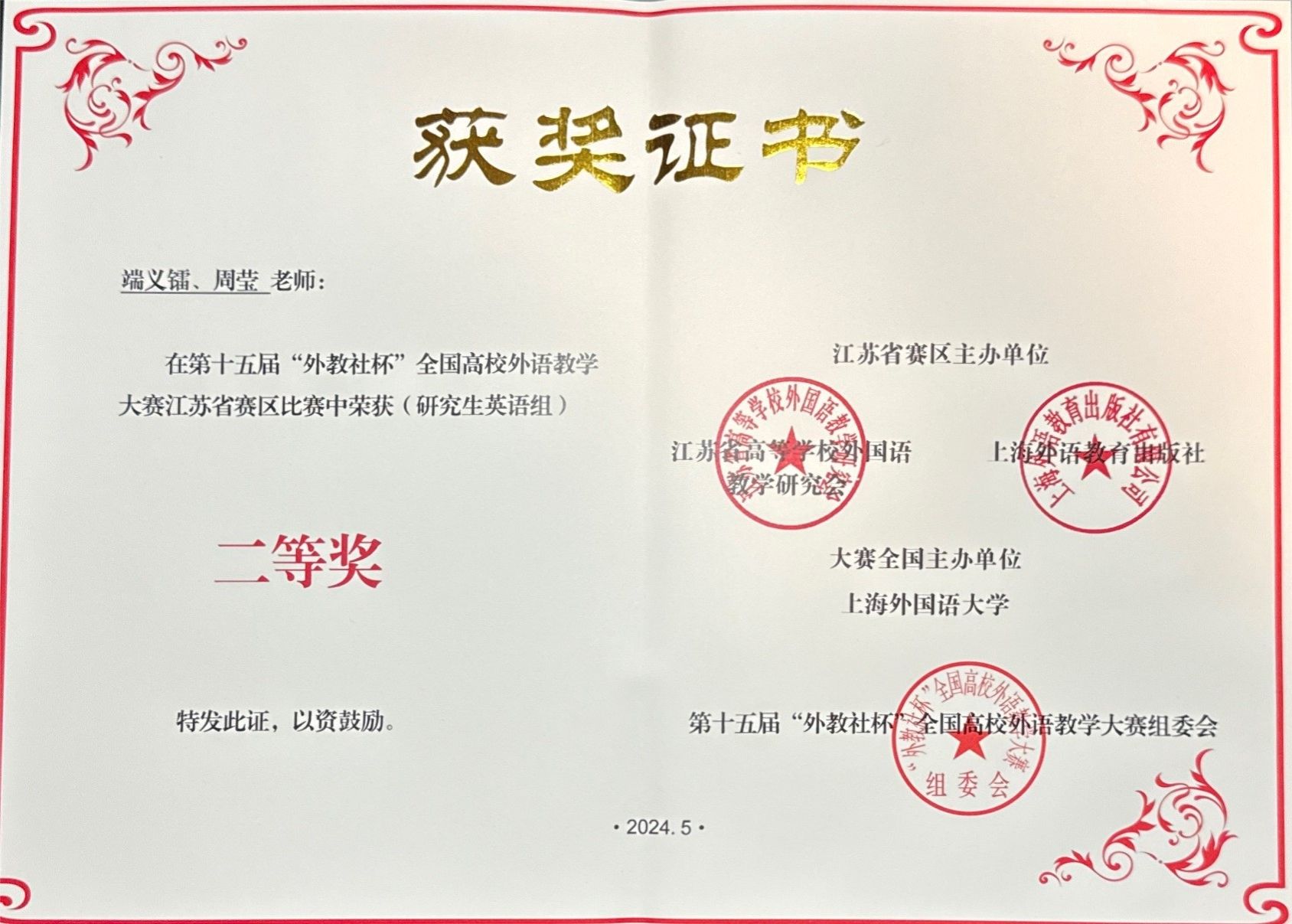 经过激烈角逐,外国语学院教师端义镭、周莹团队获研究生英语组省级二等奖。研究生英语组是kaiyun官网获批硕士点后首次有资格参加该赛道比赛,获奖教师的表现受到评委的一致好评,充分体现了kaiyun官网优良的研究生英语教学质量和水平。