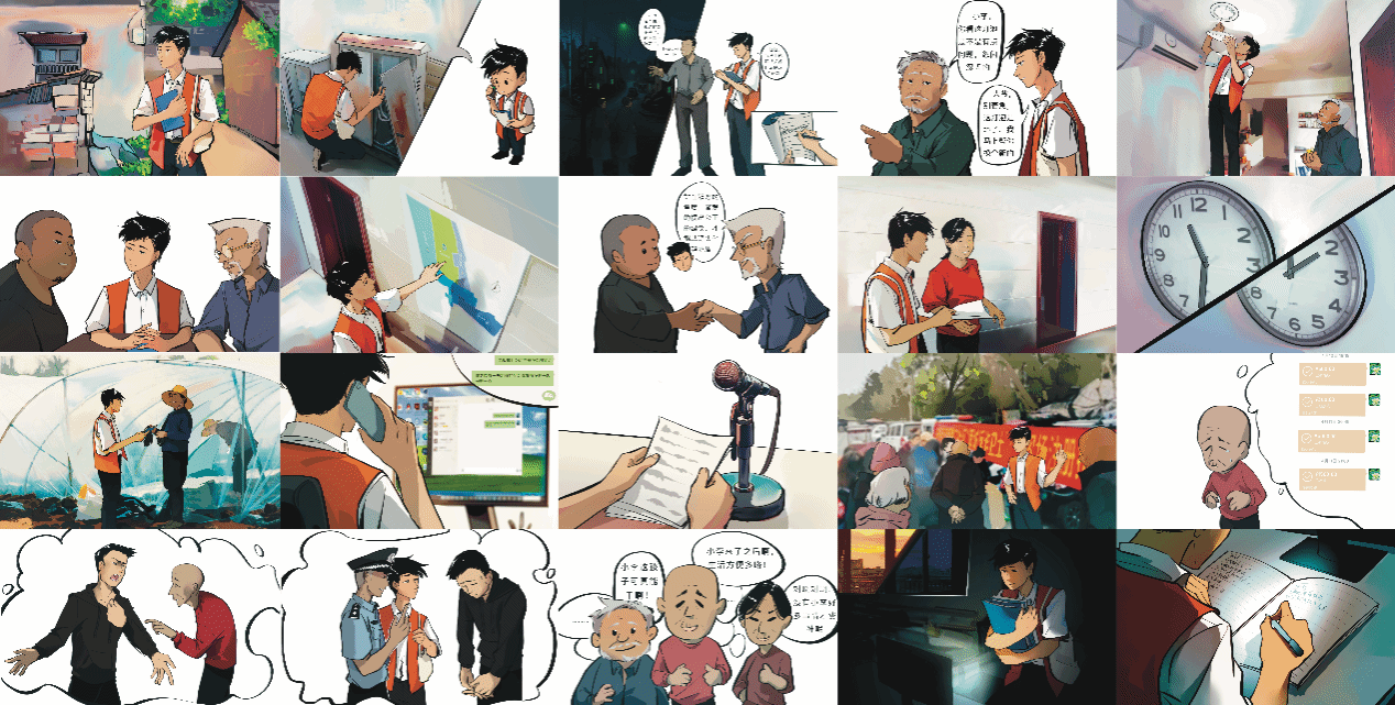 作品旨在通过漫画的艺术形式,生动形象地展现了网格员的工作场景和服务精神,让观众深刻感受网格员群体在维护社会稳定、促进和谐发展中作出的平凡而伟大的贡献。作品透过具象人物和故事情节,呈现了青年一代在平凡的岗位上奉献青春、礼赞祖国的“多幕剧”,呼应了“奋斗成就梦想,青春礼赞祖国”的大赛主题。