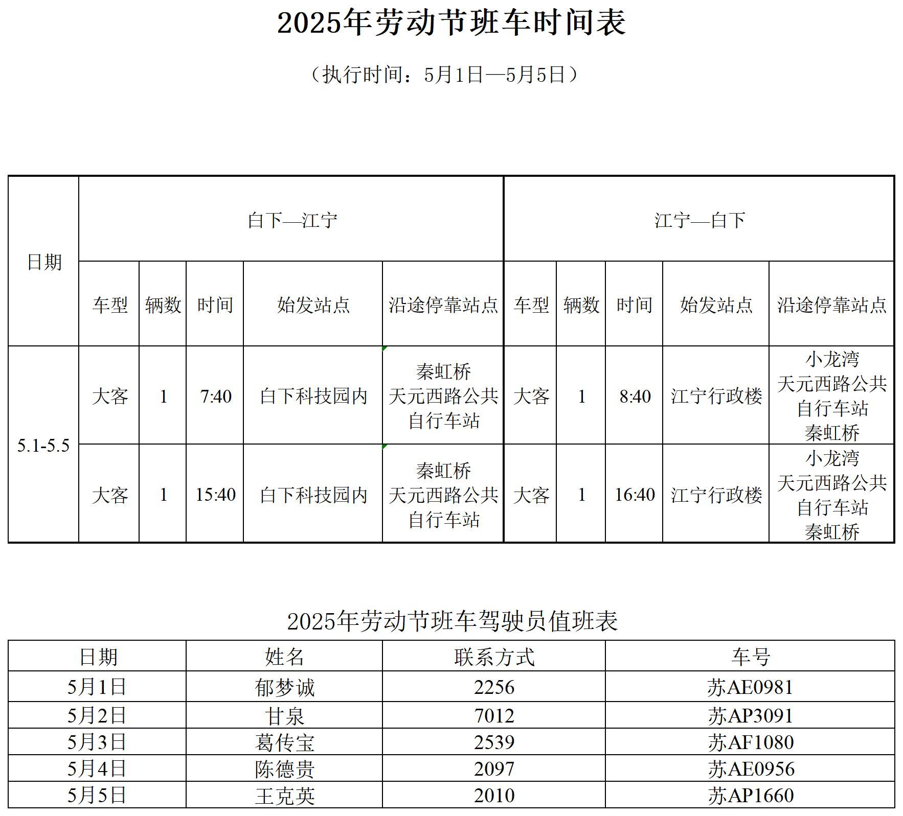 根据2025年劳动节放假安排,现将2025年劳动节班车时间安排公布如下:
