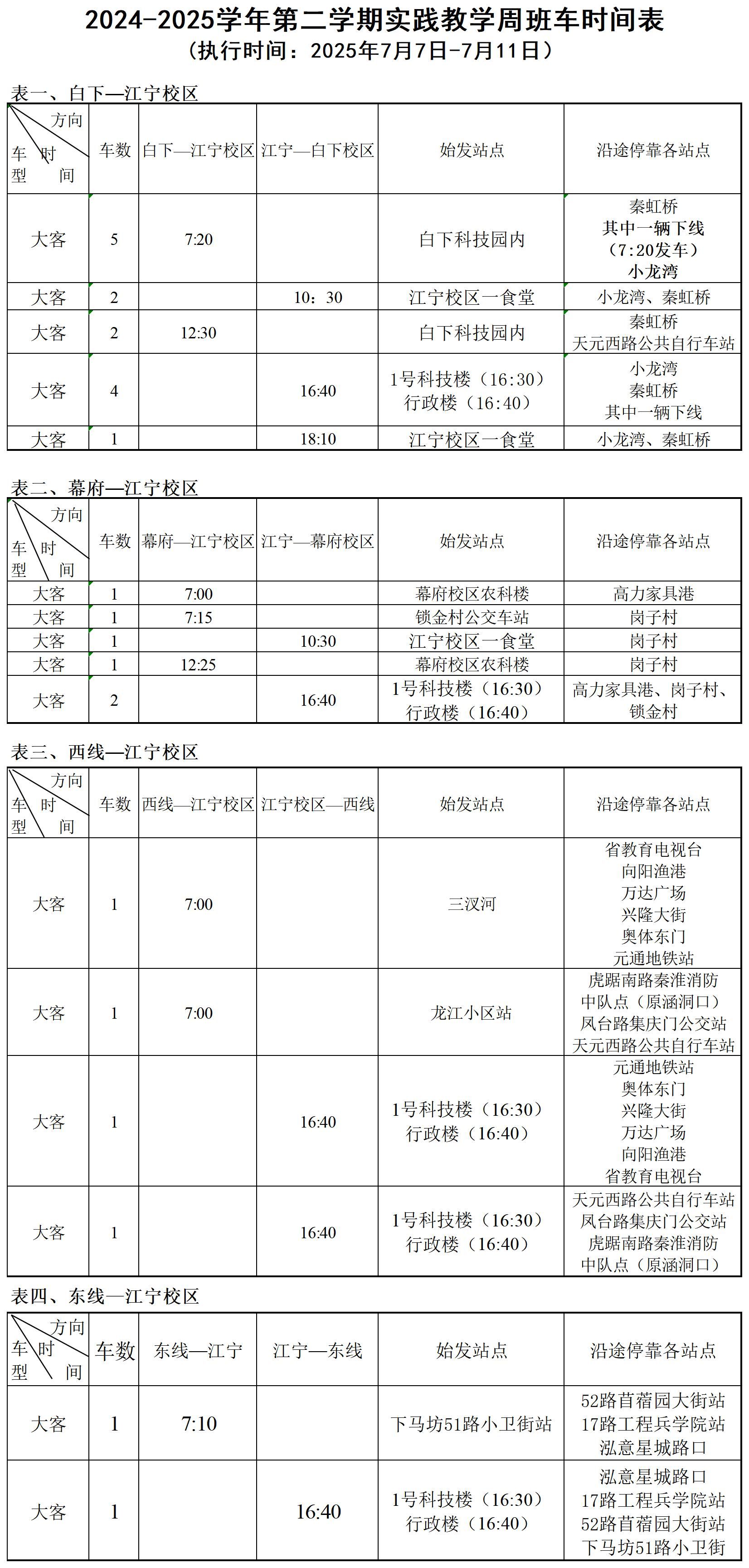 根据学校工作安排,现将2024-2025学年第二学期实践教学周班车时间安排公布如下: