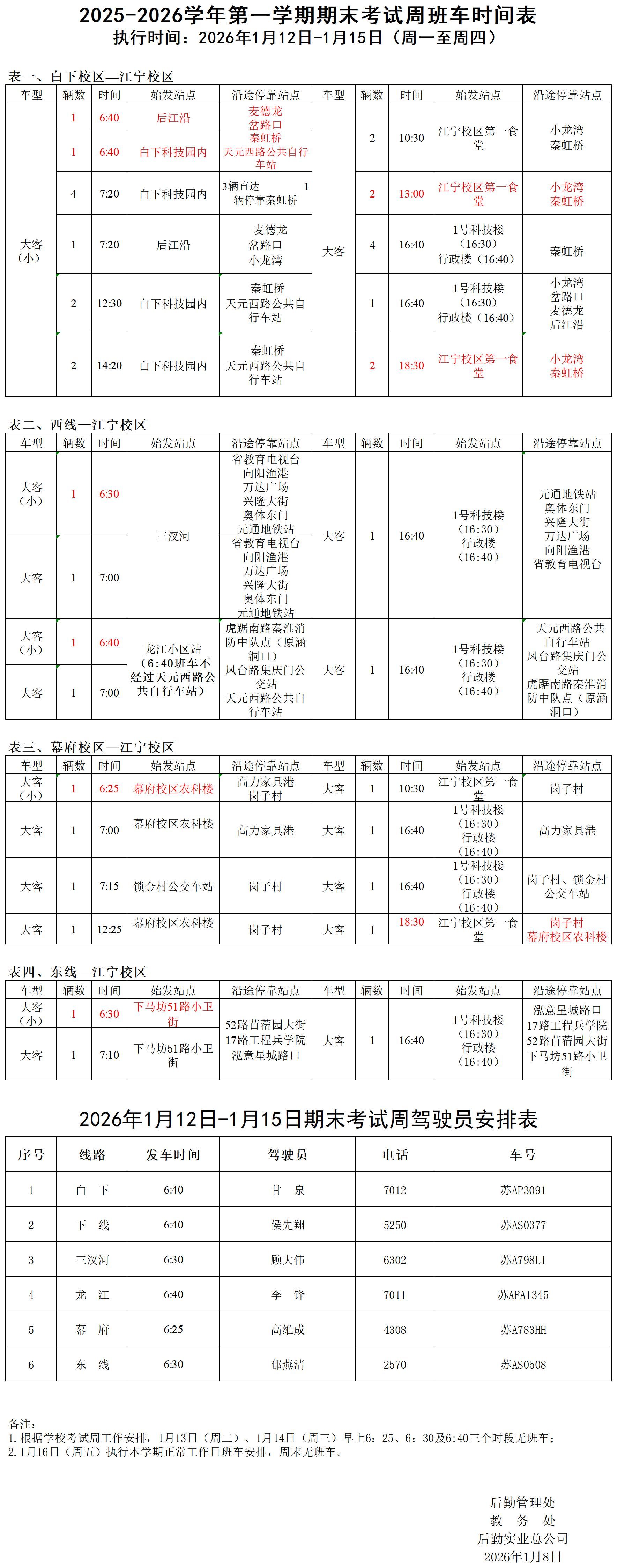 根据学校工作安排,现将2025-2026学年第一学期期末考试周班车时间安排(1月12日—1月15日)公布如下: