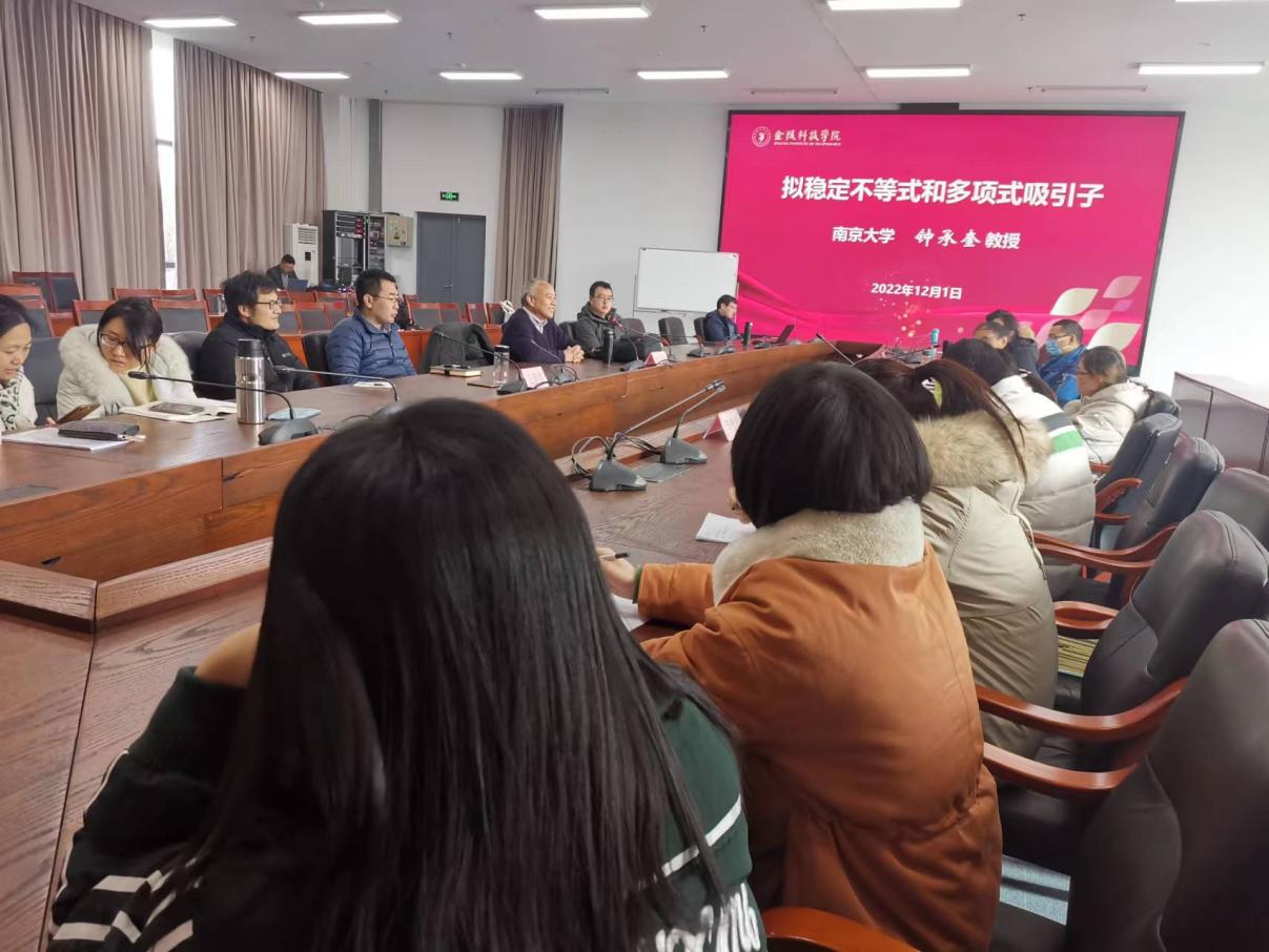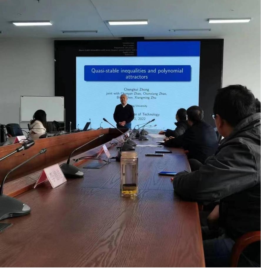12月1日,南京大学博士生导师钟承奎教授应理学院邀请来校作题为《Quasi-stable inequalities and polynomial attractors》的学术报告,并就基金申报等方面与参会教师举行了座谈。学术报告由理学院院长张国印主持,数学系师生和数学教研室教师参加了报告会。