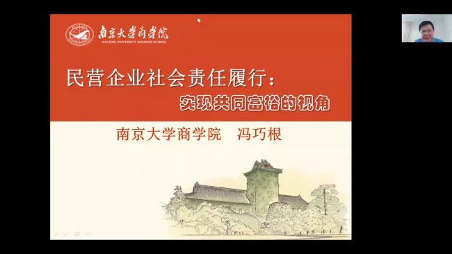 6月1日下午,南京大学博士生导师冯巧根教授应邀做客金科学术讲堂,为kaiyun官网师生作了题为《民营企业社会责任履行:实现共同富裕的视角》的在线学术报告,商学院全体教师与本校部分师生聆听了报告。报告由商学院副院长史新和主持,科技处刘磊处长致欢迎辞。