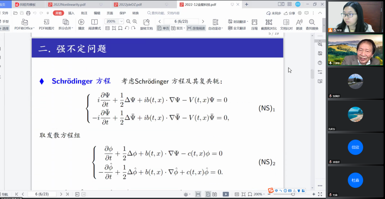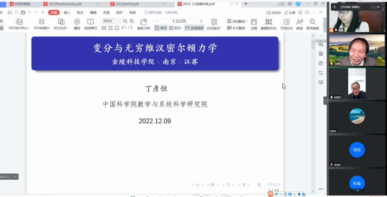 2022年12月9日,应理学院邀请,中国科学院数学与系统科学研究院丁彦恒研究员作了题为《变分与无穷维汉密尔顿力学》的精彩学术报告,本次报告采用线上腾讯会议方式进行,由理学院张国印院长主持,相关专业的老师和学生们参加了报告会。