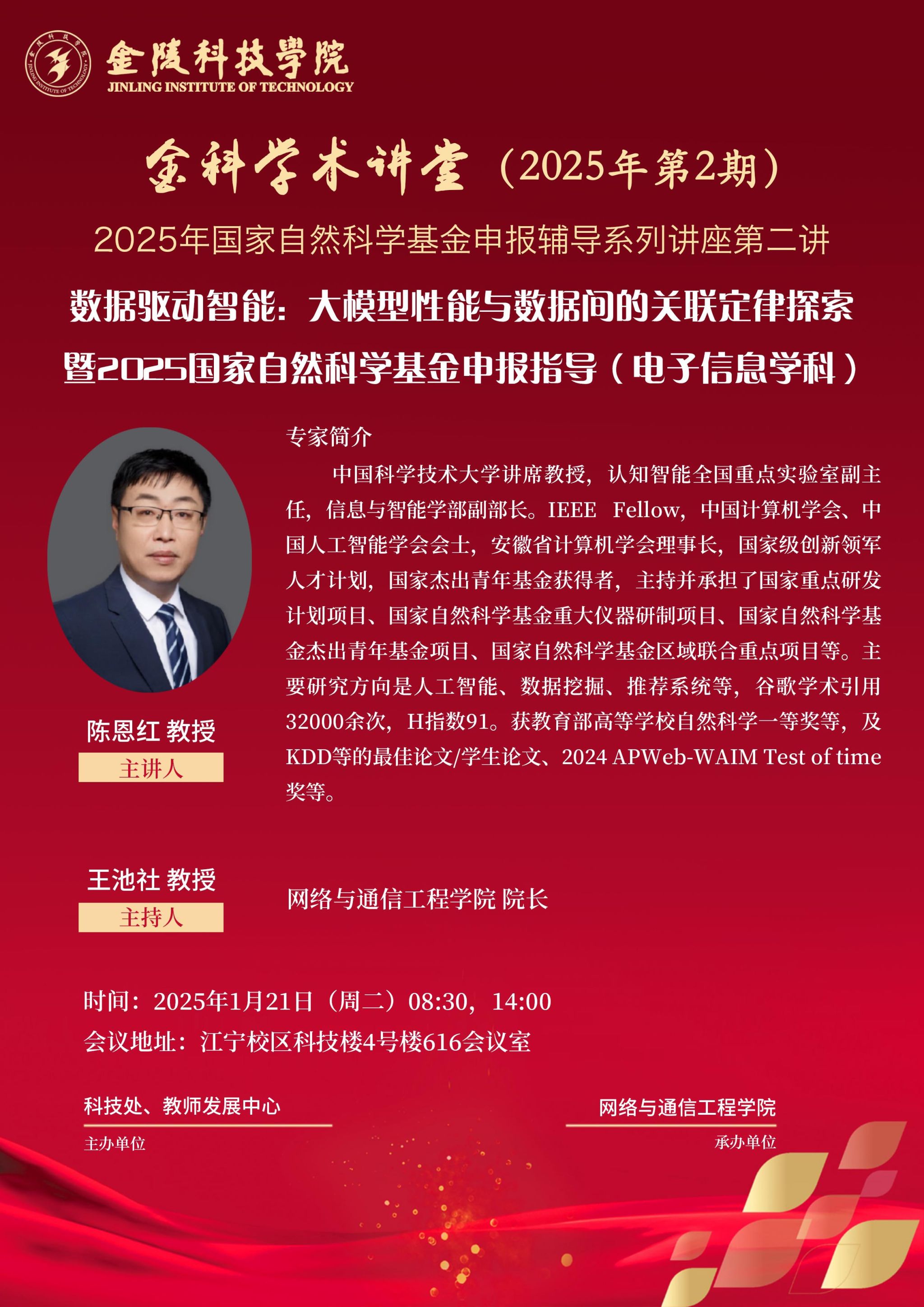 关于举办线下“金科学术讲堂——数据驱动智能:大模型性能与数据间的关联定律探索暨2025国家自然科学基金申报指导(电子信息学科)”学术报告的通知
